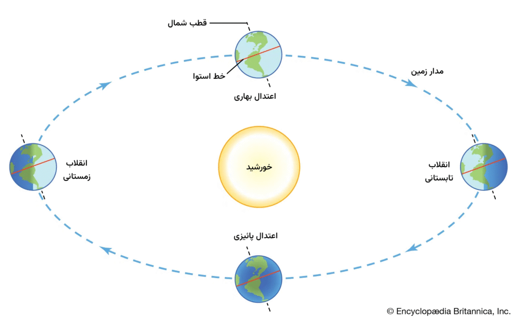 نحوهٔ تابش نور خورشید بر بخشهای مختلف زمین در طول یک سال باعث بهوجود آمدن فصلها میشود. همانطور که زمین به دور خورشید میگردد، محور قطب شمال در فضا به همان جهت ثابت اشاره میکند. حدود شش ماه از هر سال قطب شمال به سمت خورشید مایل است. در این مدت نیمکرهٔ شمالی نور مستقیمتری نسبت به نیمکرهٔ جنوبی دریافت میکند. همچنین طول روز در نیمکرهٔ شمالی بیشتر است. در شش ماه دیگر قطب شمال از خورشید دور میشود. در آن زمان نیمکرهٔ جنوبی نور مستقیمتر و ساعات روز بیشتری میگیرد.